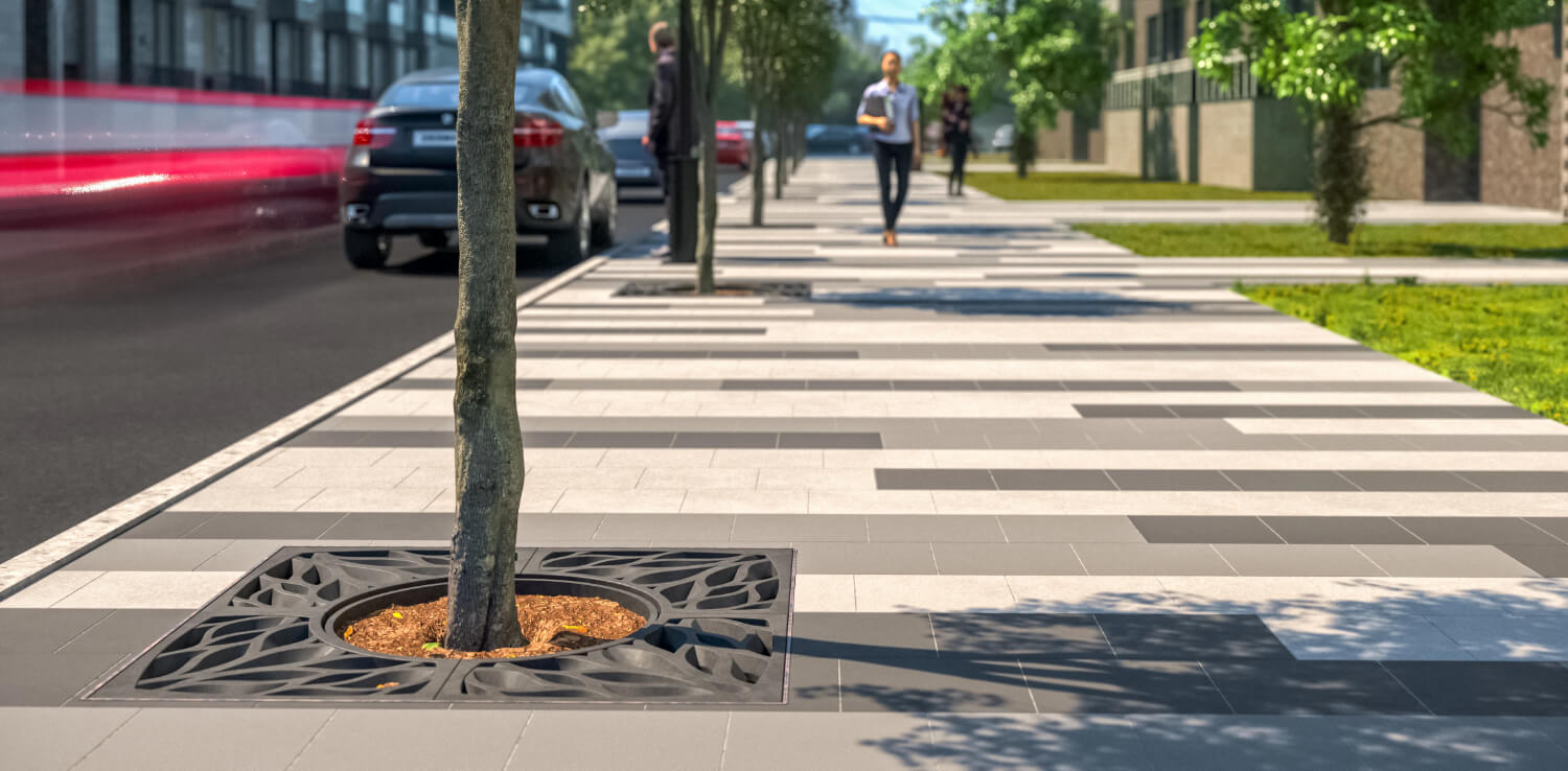 Применение приствольной решётки позволяет решить эти проблемы, а также расширяет пешеходную зону и придает уличному пространству законченный и привлекательный облик